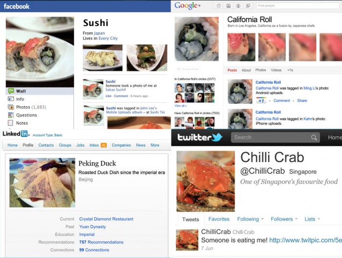 I decided to take up some of my classmates’ suggestion and do up a series of profile pages of different food dishes instead. What if food dishes have their own profile pages like regular people? Using mobile phones to take pictures of food has become so ubiquitous and common that it is as if food has its own identity, profile and character, deserving an account of its own in the various social networks.