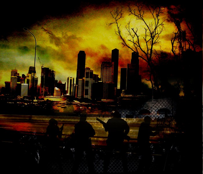 This was a 10-minute concept testing before I actually did my actual work for the montage assignment. I took a couple of photos from my library, 3 to be exact, one of the Singapore skyline, one of the tree, and one of clouds, merged them together with some layer mode changes, along with a Left 4 Dead (a zombie first person shooter game) classic silhouette at the bottom. Looks neat. Shall continue to think along these lines of Urban Fantasy.