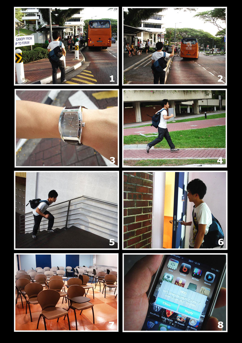 We took our photos based on the new storyboard and this is what we got. After putting the photos together, I realised that there is not enough facial expressions and there is a continuity error in photo no. 1, 2, 3 as firstly, the bus is a different bus, and secondly, the ground beneath the watch looks like the person has walked back to the position in 1. I think we will retake photos 1, 2 and 3 as feedback from the tutors is that photo 3 can be better if there is a facial expression of the person feeling late. Also, photo 8 needs to be clear enough when printed. We possibly have to try and/or retake it also. Need to add motion blurs to the running scenes too. But I guess this story is better than the first one.